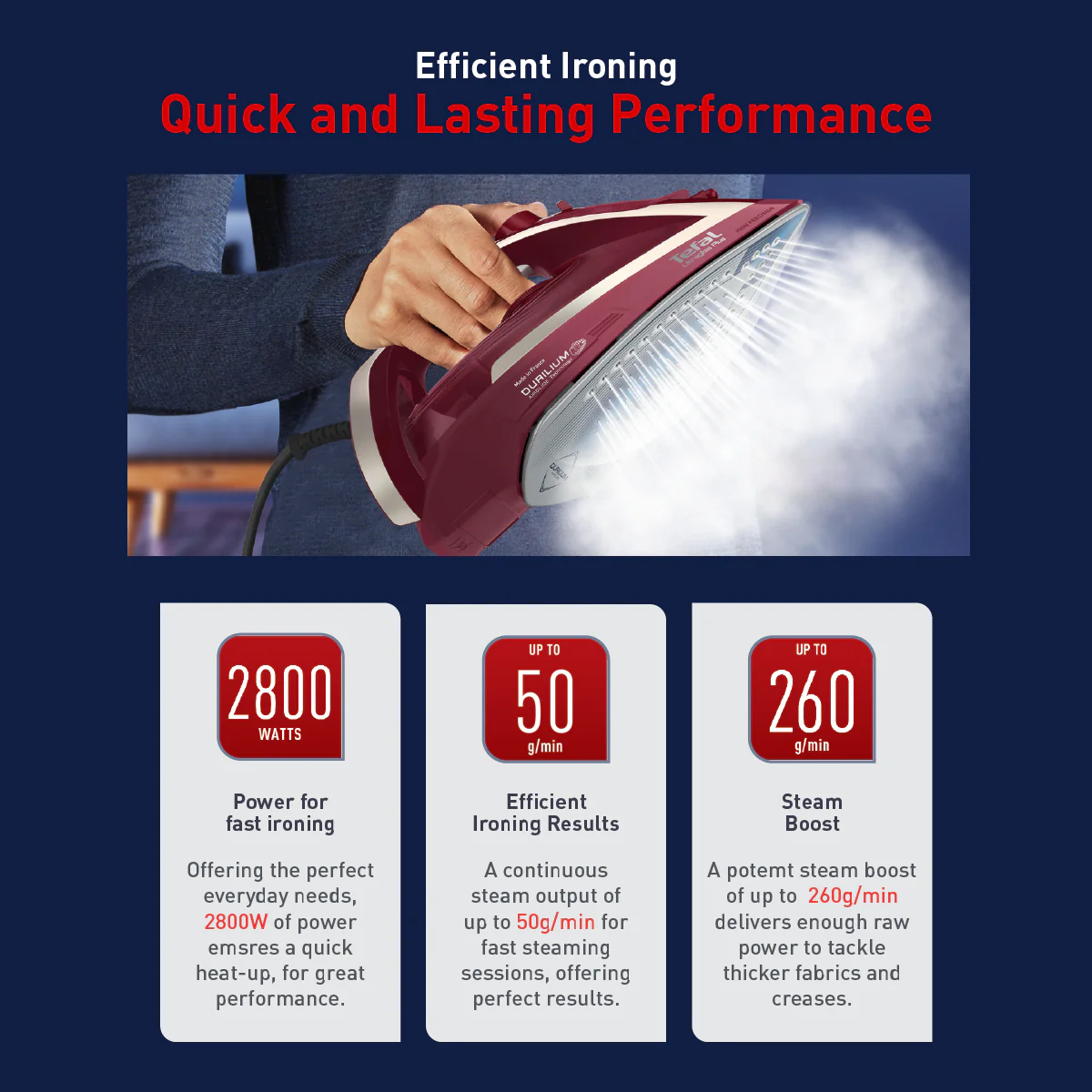 Tefal Steam Iron Ultragliss Plus 2800W (Red) FV6820 260g Steam Boost, Powerful, Maximum Steam Distribution, Safe, Versatile